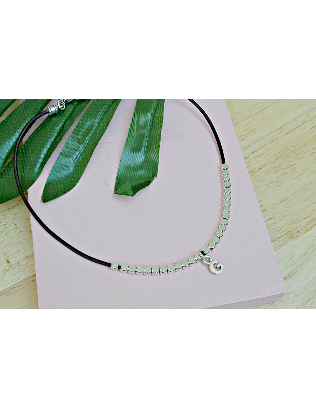 Choker de cuero con pepitas de zamak bañadas en plata de ley e inicial pequeña.